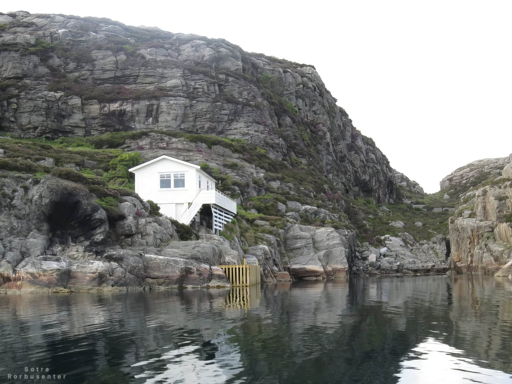 White seaside house at the base of cliffs in Sotra.