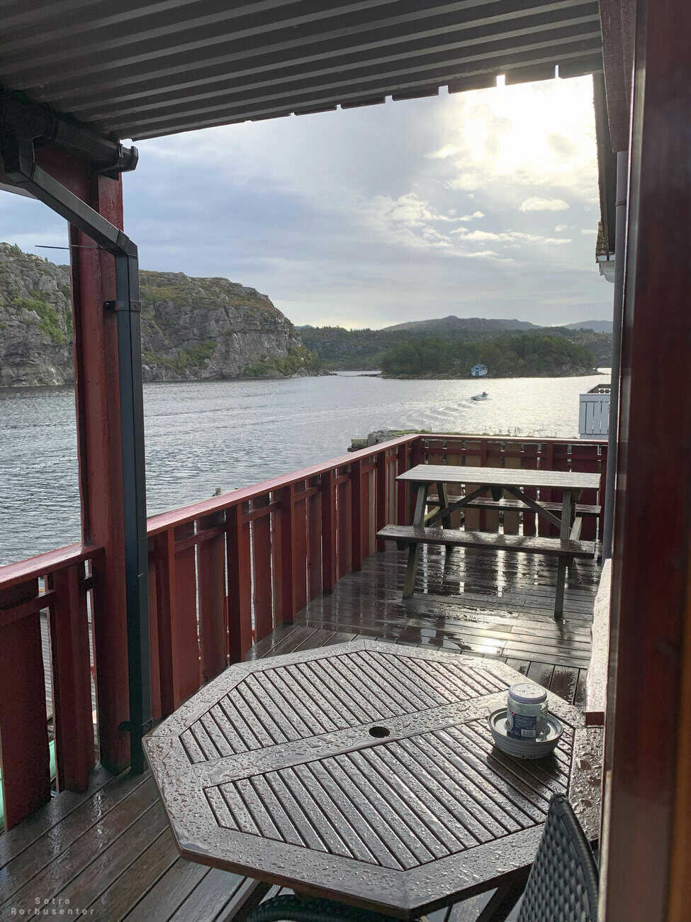 Balcony with railing and fjord view.