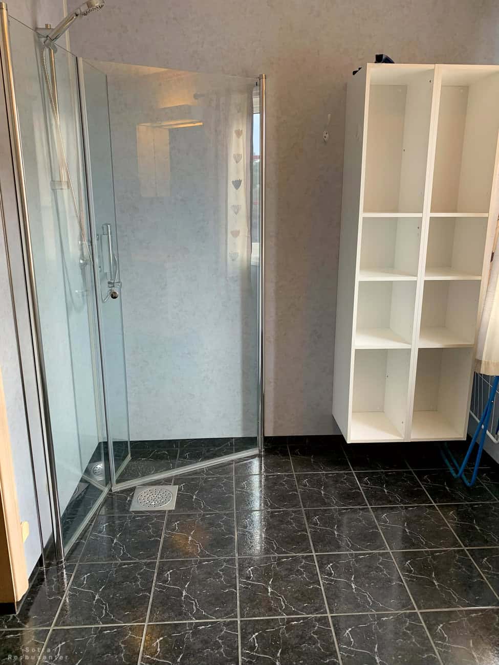 Bathroom with shower and storage shelves.