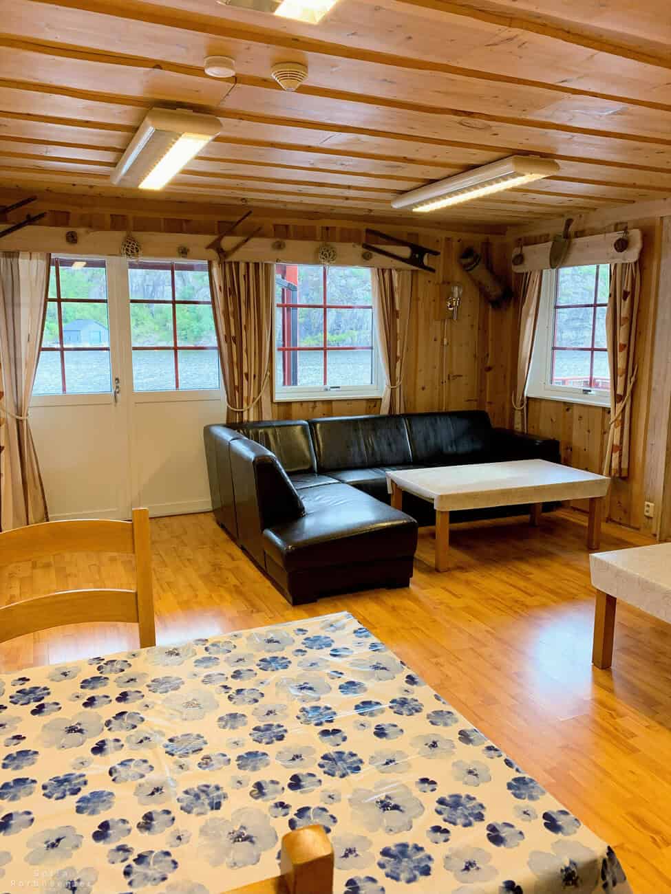 Living room with sofa, dining table, and windows.