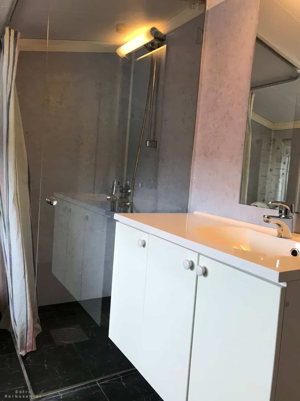Bathroom with shower and sink.